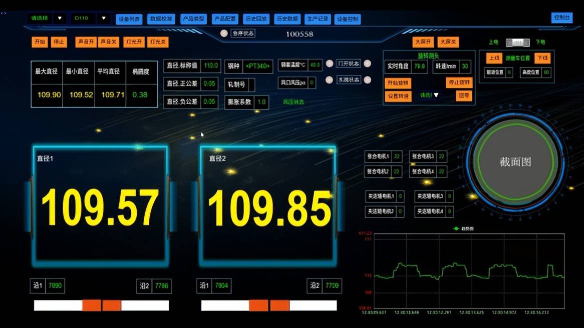 主控室液晶显示器:管材截面的最大/最小直径、平均值、椭圆度;各路测头的分项测量值;设定的钢管长度、速度、标称直径、上下公差等;尺寸波动趋势预报(输入钢管长度和速度后可以对应外径在管材的位置),缺陷分析曲线。