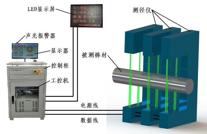 直线度测量仪主要由3台测径仪、控制柜、工控机、显示器、LED显示屏、声光报警器等组成。