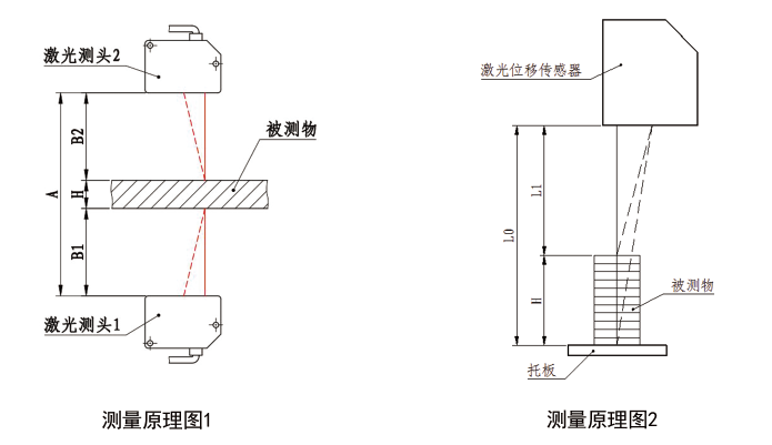 图1中激光位移传感器1和激光位移传感器2以固定间距A相对布置,工作时激光位移传感器1发射一束激光照射被测物的下表面,下表面光斑的漫反射光再通过透镜系统返回到激光位移传感器1内的CCD或CMOS芯片上,通过对CCD或cmos芯片上光斑的位置分析和计算, 可以得到激光位移传感器1到被测物下表面的实际距离B1;同理可以得到激光位移传感器2到被测物上表面的距离B2。用两个传感器之间的间距A减去两个传感器到被测物上下表面的距离B1、B2即可得到被测物的厚度H。