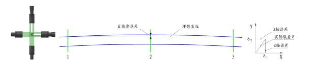数据计算:系统根据测头1和测头3采集的X轴方向位置值拟合一条直线,位置2的测量值与该直线的偏差即为位置2在X轴方向的直线度误差。同理可得到位置2在Y轴方向的直线度误差。设X轴的直线度误差为δ1、Y轴的直线度误差为δ2,即可计算出棒材直线度的实际误差δ。计算原理图见图2。