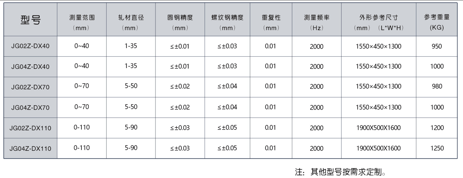 设备适用于高、低速轧制线材及棒材的在线尺寸检测,可测量圆钢外径、椭圆度和螺纹钢的基圆、纵肋、横肋、错辊、负偏差等特征尺寸。